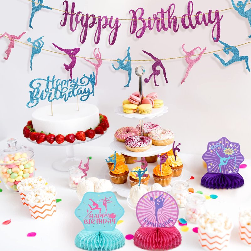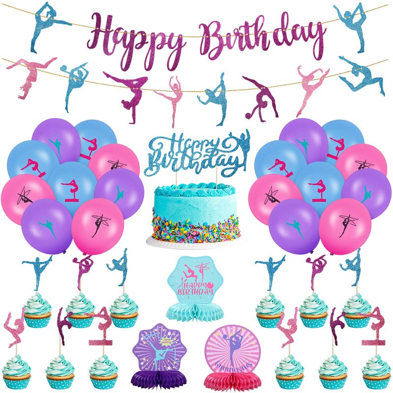 - Sufficient Quantity: you will receive 36 pieces of gymnastics birthday party supplies, including 2 happy birthday banners, 1 gymnastics cake topper, 12 gymnastics cupcake toppers, 3 gymnastics honeycomb centerpieces, and 3 styles of 18 balloons (6 for each style); Enough, variety, easily meet most of your party needs
