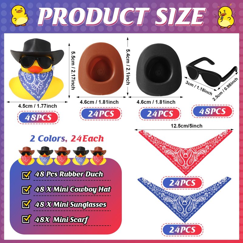 - DIY As You Like: these mini rubber ducks have many accessories, such as glasses, cowboy hats, scarves, you can match your own preferences, and you can DIY other cute decorations, adding some fun to life
