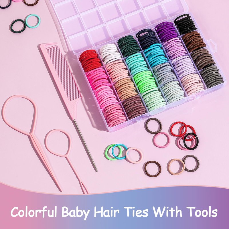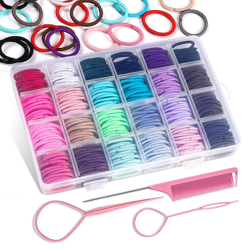 360PCS Hair Accessory Set: Elastic Ponytail Holders, Clear Organizer Box, Rat Tail Comb, 24 Colors for Kids, Toddlers, and Girls