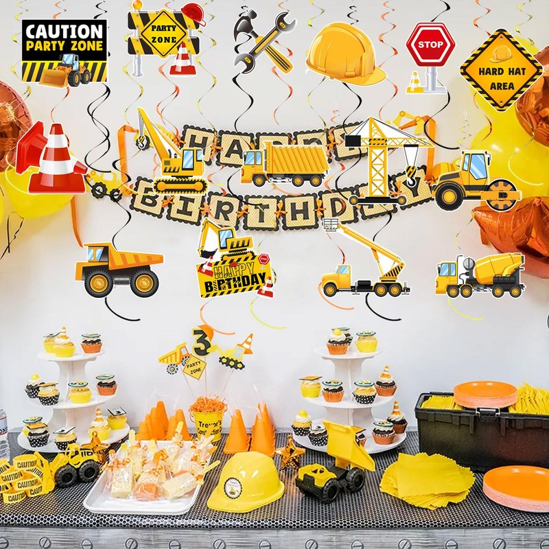 - đăConstruction DesignăConstruction birthday table party decorations cards, including excavators, bulldozers, dump trucks, cranes, traffic cones, party zone signs and so on; Perfect for construction themed birthday party decor.