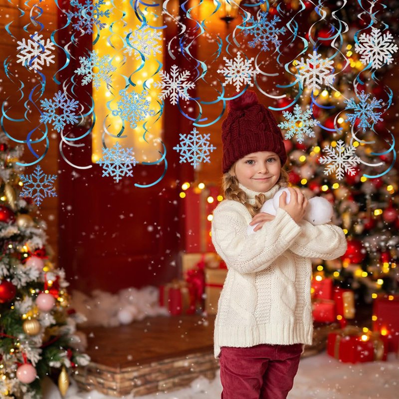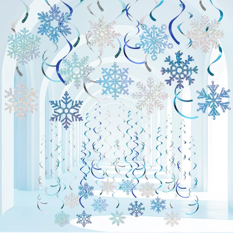 - Christmas Hanging Swirls Decorations: The Christmas snowflake party decorations are designed with Silver and Blue elements and cute Glittery snowflake themed patterns, The snowflakes of various shapes can quickly catch the eye and you can see sparkling winter frozen decorations from differen angles.They will be the nice additions to your holiday decorations or party supplies