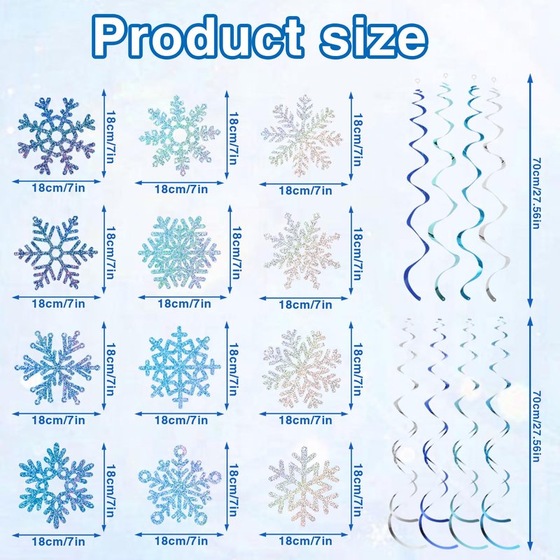 You will receive 36 pieces of Glittery Christmas psnowflake foil swirl decorations set.12pcs designs Christmas snowflake foil swirls, 12Pcs double spiral hanging swirls(4 colors)