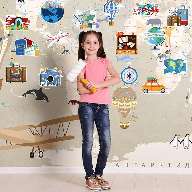 - UNIQUE DESIGN AND RICH STYLES:These travel themed hanging swirl decorations kit composed of a hot air balloon, cloud,luggage suitcase,the globe,Snow Mountain,passport,and compass..etc.Create an atmosphere of adventure and travel and having a satisfying party for your friends and family.