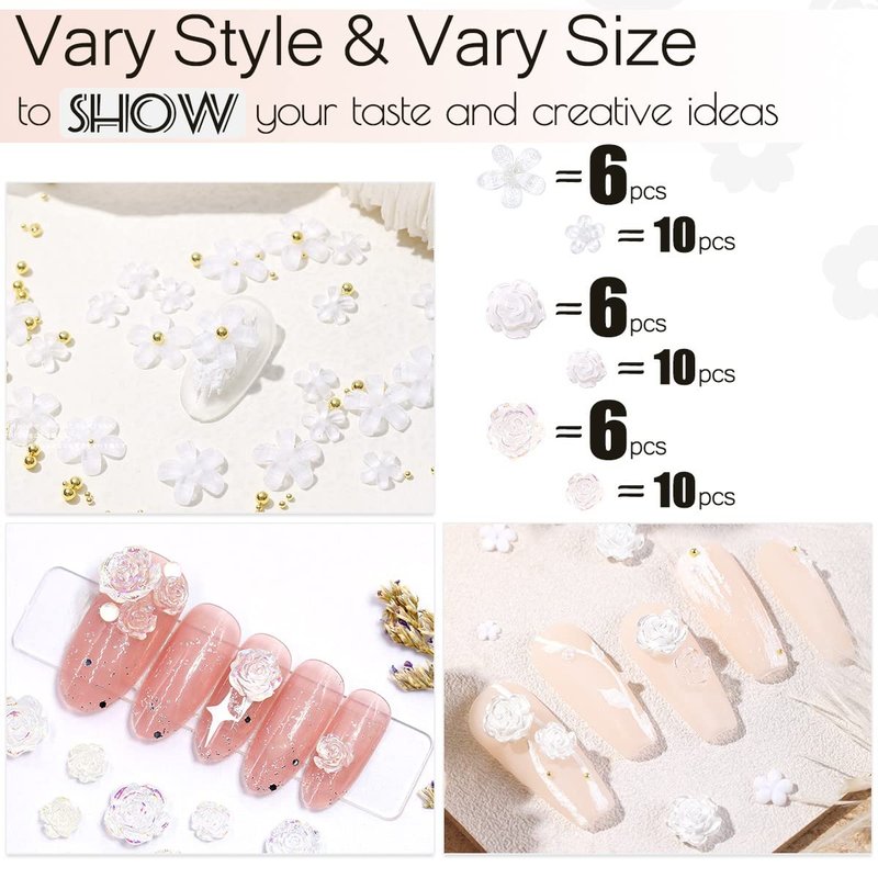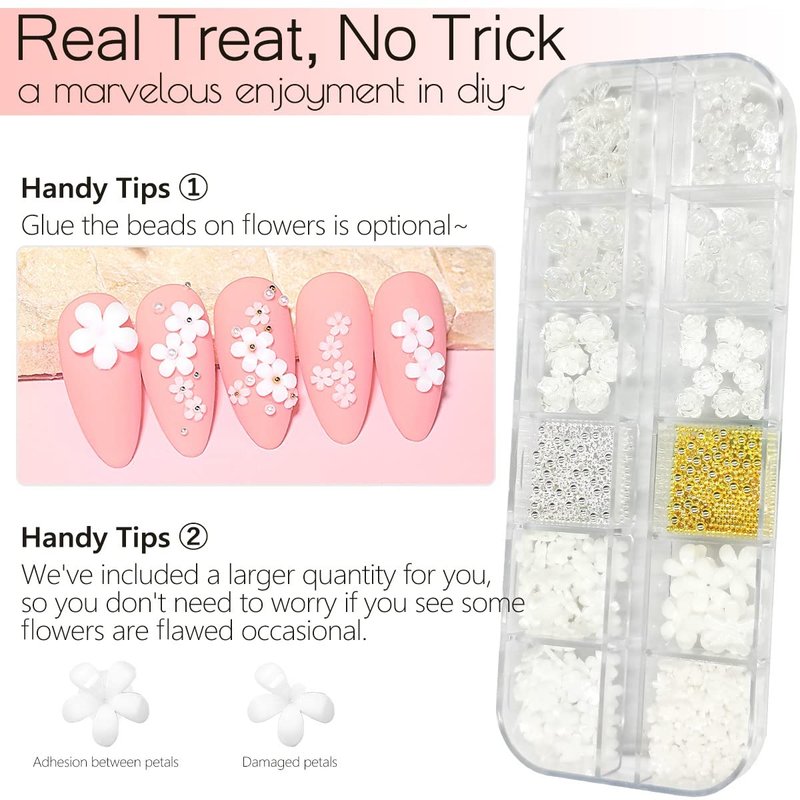 - ☘️【Flower Nail Art Kit - More Quantity】1 Box 12 grids of white flower nail art charms kit, total 850pcs nail flowers and beads. 4 kinds of special flower pattern design, White/ Aurora Rose/Camellia flowers and Five-petal-flower nail charms in 2 sizes, Resin Flower in 3 sizes, 2 sizes of golden and silver beads. Different fashionable pattern allowing you to have a shiny and attractive nail tip, look eye-catching and beautiful on your nails.