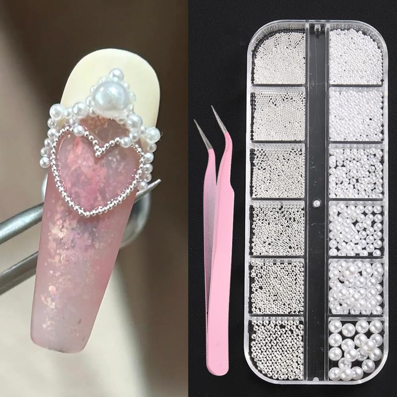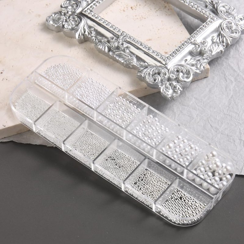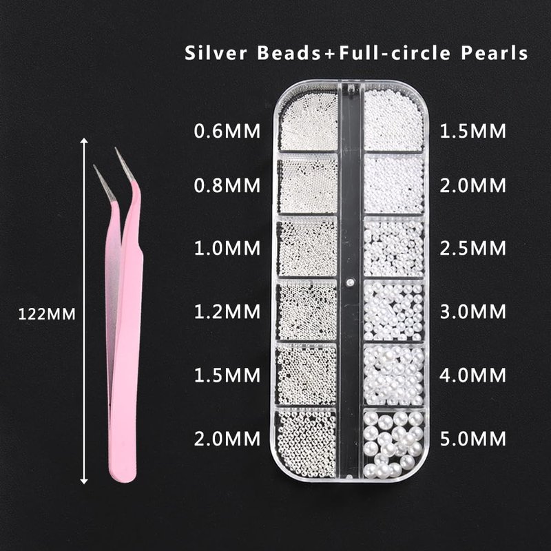 - 【You Will Get】 12 grids/box nail art charms and 1 piece of pink tweezer. The charms contain 6 grids white full circle pearls with 6 sizes (1.5mm/2.0mm/2.5mm/3.0mm/4.0mm/5.0mm); And 6 grids silver steel beads with 6 sizes( 0.6mm/0.8mm/1.0mm/1.2mm/1.5mm/2.0mm).