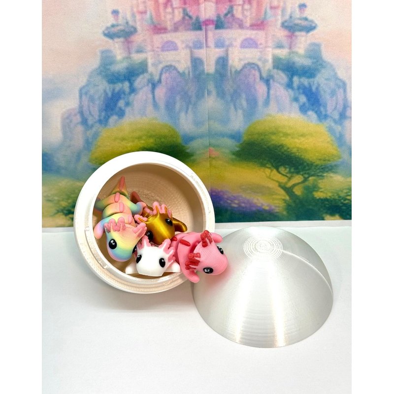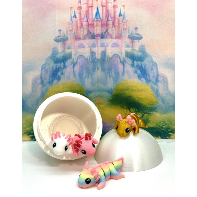 Introducing the MULTI COLOR/ASSORTED COLORS 4 pcs. Mini Axolotl with Egg, Your Articulated 3D-Printed Pal! Meticulously crafted with an eye for detail, this interactive desk accessory is not just a source of entertainment, it's also a stress-relieving toy and a chic decor piece for any space. Get ready for a unique experience with these 4 cuties, they are available for purchase with its very own Egg with Case, offering a perfect spot to conceal tiny treasures or partake in a delightful game of peek-a-boo! ------- Small Components Advisory: ------- Please be mindful that this product may contain small components and may not be suitable for very young children. Due to the nature of 3D printing, there is a potential for small components to detach if handled aggressively or dropped. Please be aware that 3D printed objects may exhibit minor imperfections like layer lines, inherent to the printing process. While we strive for the highest quality, these imperfections contribute to the distinctive character of each piece, making each raccoon uniquely crafted for you. The available color options are illustrated in the provided photos. Keep in mind that variations in color may arise from discrepancies in filament production and the characteristics of your monitor or screen. Additionally, the use of multi-colored filament rolls can influence color distribution in the prints. ------- Licensing Information: ------- Authorized Design: NOHo3D holds the official authorization for the production of this exquisite design created by Zou3D. Less