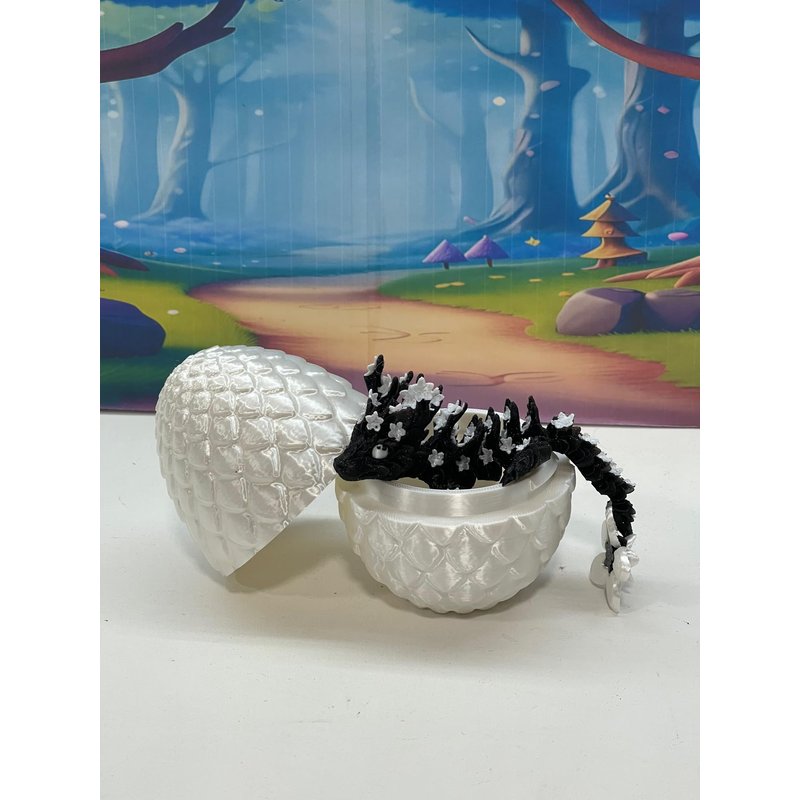 3D Printed enchanting Articulated Dragon - a mystical creature that brings a touch of fantasy to your world. Unveil the mystery of the Scaled silky White Dragon Egg and this Black and White Cherry Blossom Baby Dragon ( measures 6" long) a captivating fusion of elegance and fantasy. Encased within a meticulously designed crystal egg, this tiny dragon reveals itself with a symphony of colors - a testament to its magical heritage. ------- Small Components Advisory: ------- Please note that this product may contain small components and might not be suitable for very young children. Given the characteristics of 3D printing, there is a potential for small components to detach if handled aggressively or dropped. Therefore, we advise against allowing younger children to interact with the dragon. Please consider that 3D printed objects might include minor imperfections such as layer lines. These are a natural and inherent aspect of the printing process. We strive to produce the highest quality items, and these imperfections contribute to the unique character of each piece. Recall the unique creation of each dragon, crafted exclusively for you. The color selections available are depicted in the provided photos. Please be aware that variations in color may occur due to discrepancies in filament production and the characteristics of the monitor or screen you are utilizing to view the listing. Additionally, the arrangement of prints using multi-colored filament rolls can influence color distribution. ------- Licensing Information: ------- Authorized Design: NOHo3D holds the official authorization for the production of this exquisite design created by CinderWing3D.