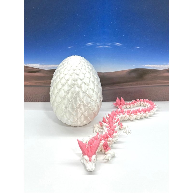 3D Printed enchanting Articulated Crystal Dragon - a mystical creature that brings a touch of fantasy to your world. Unveil the mystery of the Satin Scaled Dragon Egg and this White and Pink Crystal Dragon ( measures 12.5" long) a captivating fusion of elegance and fantasy. Encased within a meticulously designed crystal egg, this dragon reveals itself with a symphony of colors - a testament to its magical heritage. ------- Small Components Advisory: ------- Please note that this product may contain small components and might not be suitable for very young children. Given the characteristics of 3D printing, there is a potential for small components to detach if handled aggressively or dropped. Therefore, we advise against allowing younger children to interact with the dragon. Please consider that 3D printed objects might include minor imperfections such as layer lines. These are a natural and inherent aspect of the printing process. We strive to produce the highest quality items, and these imperfections contribute to the unique character of each piece. Recall the unique creation of each dragon, crafted exclusively for you. The color selections available are depicted in the provided photos. Please be aware that variations in color may occur due to discrepancies in filament production and the characteristics of the monitor or screen you are utilizing to view the listing. Additionally, the arrangement of prints using multi-colored filament rolls can influence color distribution. ------- Licensing Information: ------- Authorized Design: NOHo3D holds the official authorization for the production of this exquisite design created by CinderWing3D.