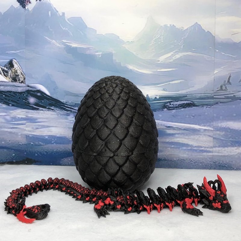 3D Printed Articulated Black and Red HEART Dragon - a mystical creature that brings a touch of fantasy to your world. Unveil the mystery of the Black Dragon Egg and this Night Sky Black and Red HEART Dragon ( measures 12" long) a captivating fusion of elegance and fantasy. Encased within a meticulously designed crystal egg, this tiny dragon reveals itself with a symphony of colors - a testament to its magical heritage. ------- Small Components Advisory: ------- Please note that this product may contain small components and might not be suitable for very young children. Given the characteristics of 3D printing, there is a potential for small components to detach if handled aggressively or dropped. Therefore, we advise against allowing younger children to interact with the dragon. Please consider that 3D printed objects might include minor imperfections such as layer lines. These are a natural and inherent aspect of the printing process. We strive to produce the highest quality items, and these imperfections contribute to the unique character of each piece. Remember the unique creation of each dragon, crafted exclusively for you. The color selections available are depicted in the provided photos. Please be aware that variations in color may occur due to discrepancies in filament production and the characteristics of the monitor or screen you are utilizing to view the listing. Additionally, the arrangement of prints using multi-colored filament rolls can influence color distribution. ------- Licensing Information: ------- Authorized Design: NOHo3D holds the official authorization for the production of this exquisite design created by CinderWing3D.