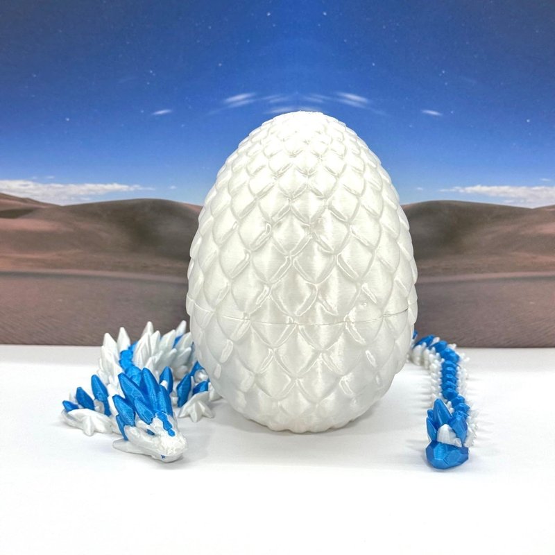 3D Printed enchanting Articulated Gemstone Dragon - a mystical creature that brings a touch of fantasy to your world. Unveil the mystery of the Dragon Egg and this White AND Blue Gemstone Dragon ( measures approximately 12.5" long) a captivating fusion of elegance and fantasy. Encased within a meticulously designed egg, this dragon reveals itself with a symphony of colors - a testament to its magical heritage. ------- Small Components Advisory: ------- Please note that this product may contain small components and might not be suitable for very young children. Given the characteristics of 3D printing, there is a potential for small components to detach if handled aggressively or dropped. Therefore, we advise against allowing younger children to interact with the dragon. Please consider that 3D printed objects might include minor imperfections such as layer lines. These are a natural and inherent aspect of the printing process. We strive to produce the highest quality items, and these imperfections contribute to the unique character of each piece. Recall the unique creation of each dragon, crafted exclusively for you. The color selections available are depicted in the provided photos. Please be aware that variations in color may occur due to discrepancies in filament production and the characteristics of the monitor or screen you are utilizing to view the listing. Additionally, the arrangement of prints using multi-colored filament rolls can influence color distribution. ------- Licensing Information: ------- Authorized Design: NOHo3D holds the official authorization for the production of this exquisite design created by CinderWing3D.