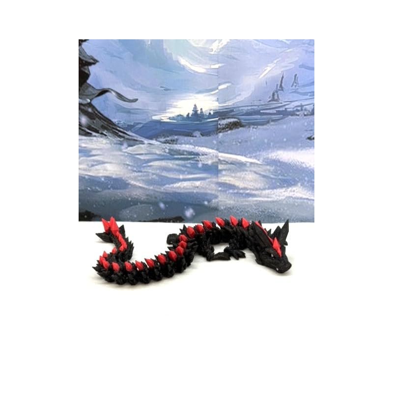 3D Printed Articulated Black and Gold Crystal Dragon - a mystical creature that brings a touch of fantasy to your world. Unveil the mystery of this Night Sky Black and Red Crystal Dragon ( measures 12" long) a captivating fusion of elegance and fantasy. Encased within a meticulously designed crystal egg, this tiny dragon reveals itself with a symphony of colors - a testament to its magical heritage. ------- Small Components Advisory: ------- Please note that this product may contain small components and might not be suitable for very young children. Given the characteristics of 3D printing, there is a potential for small components to detach if handled aggressively or dropped. Therefore, we advise against allowing younger children to interact with the dragon. Please consider that 3D printed objects might include minor imperfections such as layer lines. These are a natural and inherent aspect of the printing process. We strive to produce the highest quality items, and these imperfections contribute to the unique character of each piece. Remember the unique creation of each dragon, crafted exclusively for you. The color selections available are depicted in the provided photos. Please be aware that variations in color may occur due to discrepancies in filament production and the characteristics of the monitor or screen you are utilizing to view the listing. Additionally, the arrangement of prints using multi-colored filament rolls can influence color distribution. ------- Licensing Information: ------- Authorized Design: NOHo3D holds the official authorization for the production of this exquisite design created by CinderWing3D.