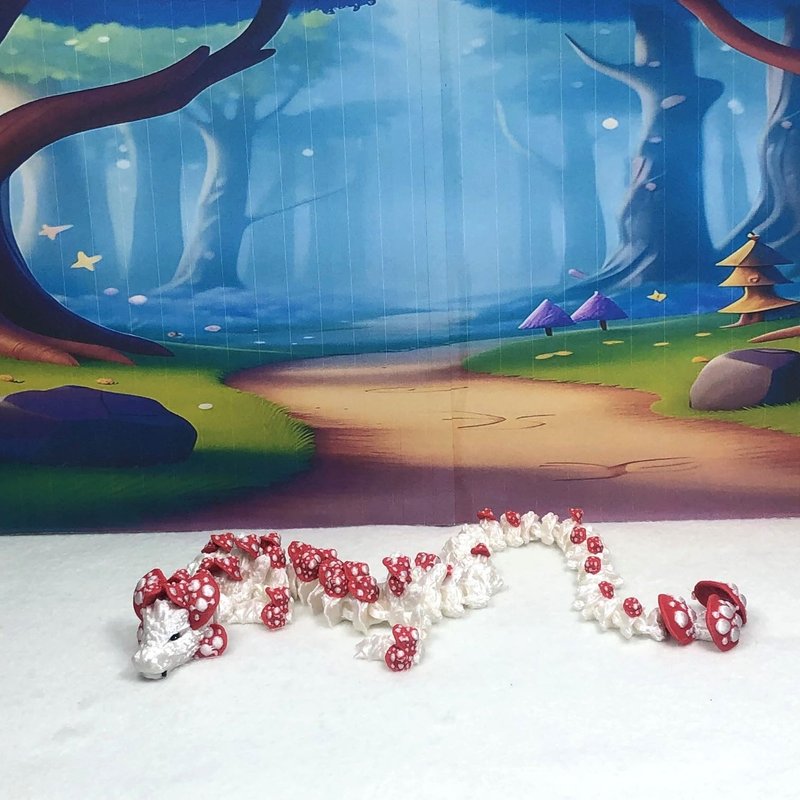 3D Printed enchanting Articulated Mushroom Dragon - a mystical creature that brings a touch of fantasy to your world. Unveil the mystery of this white AND red Mushroom Dragon ( measures approximately 12" long) a captivating fusion of elegance and fantasy. this dragon reveals itself with a symphony of colors - a testament to its magical heritage. ------- Choking Hazard Small Components Advisory NOT for Children under 3 years old: ------- Please note that this product may contain small components and might not be suitable for very young children. Given the characteristics of 3D printing, there is a potential for small components to detach if handled aggressively or dropped. Therefore, we advise against allowing younger children to interact with the dragon. Please consider that 3D printed objects might include minor imperfections such as layer lines. These are a natural and inherent aspect of the printing process. We strive to produce the highest quality items, and these imperfections contribute to the unique character of each piece. Recall the unique creation of each dragon, crafted exclusively for you. The color selections available are depicted in the provided photos. Please be aware that variations in color may occur due to discrepancies in filament production and the characteristics of the monitor or screen you are utilizing to view the listing. Additionally, the arrangement of prints using multi-colored filament rolls can influence color distribution. ------- Licensing Information: ------- Authorized Design: NOHo3D holds the official authorization for the production of this exquisite design created by CinderWing3D.