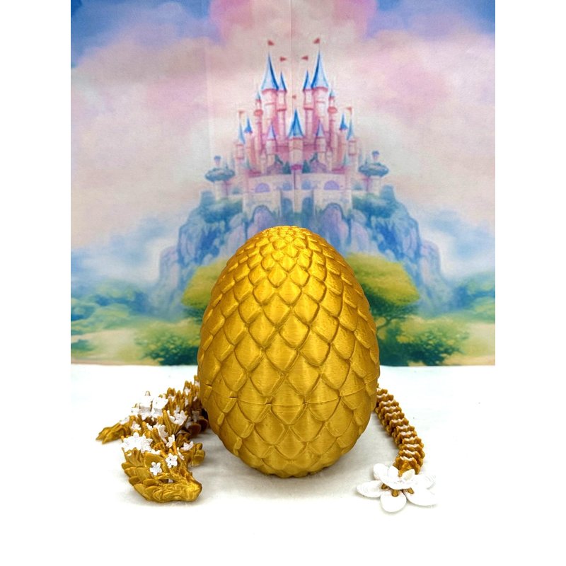 3D Printed enchanting Articulated Cherry Blossom Dragon - a mystical creature that brings a touch of fantasy to your world. Unveil the mystery of the Scaled silky GOLD Dragon Egg and this Gold and White Cherry Blossom Dragon ( measures 12" long) a captivating fusion of elegance and fantasy. Encased within a meticulously designed crystal egg, this tiny dragon reveals itself with a symphony of colors - a testament to its magical heritage. ------- Small Components Advisory: ------- Please note that this product may contain small components and might not be suitable for very young children. Given the characteristics of 3D printing, there is a potential for small components to detach if handled aggressively or dropped. Therefore, we advise against allowing younger children to interact with the dragon. Please consider that 3D printed objects might include minor imperfections such as layer lines. These are a natural and inherent aspect of the printing process. We strive to produce the highest quality items, and these imperfections contribute to the unique character of each piece. Recall the unique creation of each dragon, crafted exclusively for you. The color selections available are depicted in the provided photos. Please be aware that variations in color may occur due to discrepancies in filament production and the characteristics of the monitor or screen you are utilizing to view the listing. Additionally, the arrangement of prints using multi-colored filament rolls can influence color distribution. ------- Licensing Information: ------- Authorized Design: NOHo3D holds the official authorization for the production of this exquisite design created by CinderWing3D.