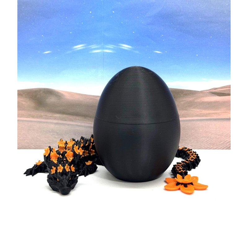 3D Printed enchanting Articulated Cherry Blossom Dragon - a mystical creature that brings a touch of fantasy to your world. Unveil the mystery of the Scaled Dragon Egg and this Black and Orange Cherry Blossom Dragon ( measures 12" long) a captivating fusion of elegance and fantasy. Encased within a meticulously designed crystal egg, this awesome dragon reveals itself with a symphony of colors - a testament to its magical heritage. ------- Small Components Advisory: ------- Please note that this product may contain small components and might not be suitable for very young children. Given the characteristics of 3D printing, there is a potential for small components to detach if handled aggressively or dropped. Therefore, we advise against allowing younger children to interact with the dragon. Please consider that 3D printed objects might include minor imperfections such as layer lines. These are a natural and inherent aspect of the printing process. We strive to produce the highest quality items, and these imperfections contribute to the unique character of each piece. Recall the unique creation of each dragon, crafted exclusively for you. The color selections available are depicted in the provided photos. Please be aware that variations in color may occur due to discrepancies in filament production and the characteristics of the monitor or screen you are utilizing to view the listing. Additionally, the arrangement of prints using multi-colored filament rolls can influence color distribution. ------- Licensing Information: ------- Authorized Design: NOHo3D holds the official authorization for the production of this exquisite design created by CinderWing3D.