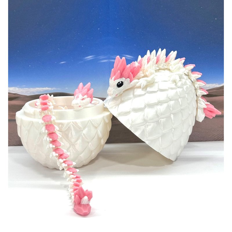 3D Printed enchanting Mother and child Articulated Gemstone Dragon - a mystical creature that brings a touch of fantasy to your world. Unveil the mystery of the Dragon Egg and this White and Pink Gemstone Dragon ( Mother Dragon measures 12.5" long and the baby dragon is 6 inches long) a captivating fusion of elegance and fantasy. Encased within a meticulously designed crystal egg, this tiny dragon reveals itself with a symphony of colors - a testament to its magical heritage. ------- Small Components Advisory: ------- Please note that this product may contain small components and might not be suitable for very young children. Given the characteristics of 3D printing, there is a potential for small components to detach if handled aggressively or dropped. Therefore, we advise against allowing younger children to interact with the dragon. Please consider that 3D printed objects might include minor imperfections such as layer lines. These are a natural and inherent aspect of the printing process. We strive to produce the highest quality items, and these imperfections contribute to the unique character of each piece. Recall the unique creation of each dragon, crafted exclusively for you. The color selections available are depicted in the provided photos. Please be aware that variations in color may occur due to discrepancies in filament production and the characteristics of the monitor or screen you are utilizing to view the listing. Additionally, the arrangement of prints using multi-colored filament rolls can influence color distribution. ------- Licensing Information: ------- Authorized Design: NOHo3D holds the official authorization for the production of this exquisite design created by CinderWing3D.