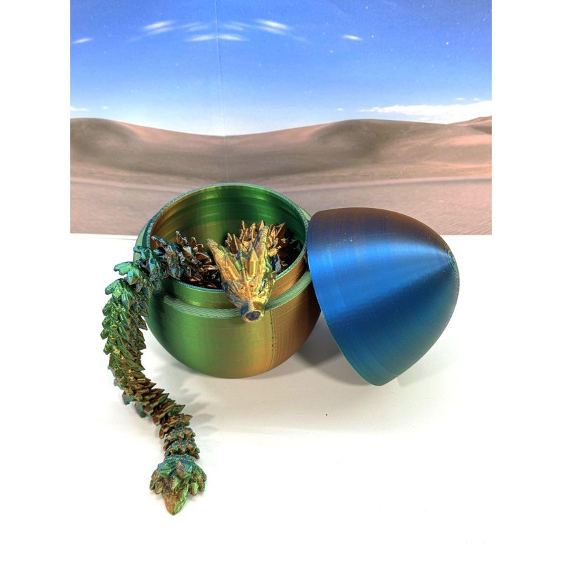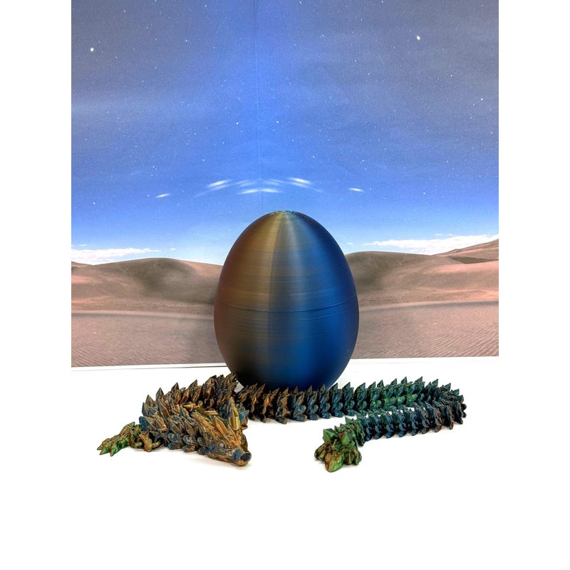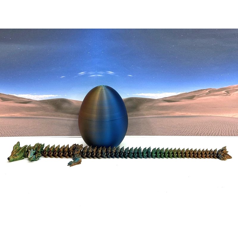 3D Printed enchanting Articulated WOLF Dragon - a mystical creature that brings a touch of fantasy to your world. Unveil the mystery of the Dragon Egg and this tri color-Orange Blue Green WOLF Dragon ( measures approximately 12" long) a captivating fusion of elegance and fantasy. Encased within a CLASSIC egg, this tiny dragon reveals itself with a symphony of colors - a testament to its magical heritage. ------- Small Components Advisory: ------- Please note that this product may contain small components and might not be suitable for very young children. Given the characteristics of 3D printing, there is a potential for small components to detach if handled aggressively or dropped. Therefore, we advise against allowing younger children to interact with the dragon. Please consider that 3D printed objects might include minor imperfections such as layer lines. These are a natural and inherent aspect of the printing process. We strive to produce the highest quality items, and these imperfections contribute to the unique character of each piece. Recall the unique creation of each dragon, crafted exclusively for you. Authorized Design: NOHo3D holds the official authorization for the production of this exquisite design created by CinderWing3D.