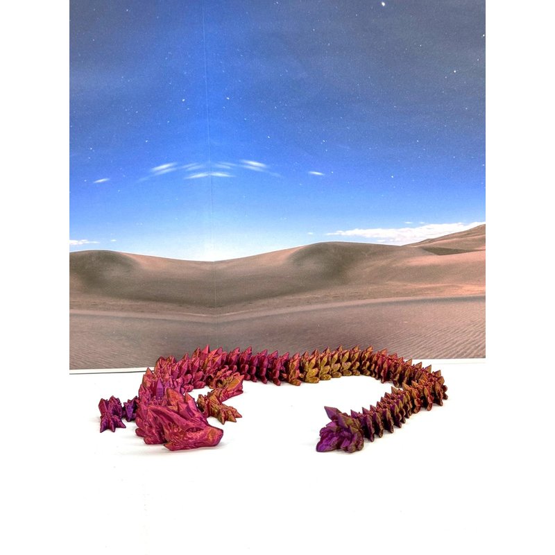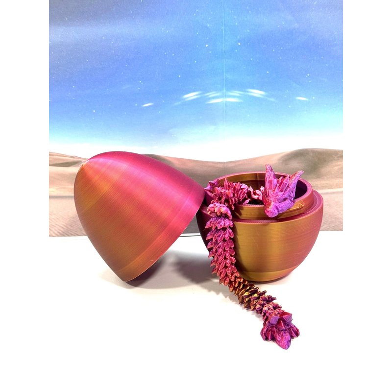 3D Printed enchanting Articulated WOLF Dragon - a mystical creature that brings a touch of fantasy to your world. Unveil the mystery of the Dragon Egg and this tri color-Red Purple Gold WOLF Dragon ( measures approximately 12" long) a captivating fusion of elegance and fantasy. Encased within a CLASSIC egg, this tiny dragon reveals itself with a symphony of colors - a testament to its magical heritage. ------- Small Components Advisory: ------- Please note that this product may contain small components and might not be suitable for very young children. Given the characteristics of 3D printing, there is a potential for small components to detach if handled aggressively or dropped. Therefore, we advise against allowing younger children to interact with the dragon. Please consider that 3D printed objects might include minor imperfections such as layer lines. These are a natural and inherent aspect of the printing process. We strive to produce the highest quality items, and these imperfections contribute to the unique character of each piece. Recall the unique creation of each dragon, crafted exclusively for you. Authorized Design: NOHo3D holds the official authorization for the production of this exquisite design created by CinderWing3D.