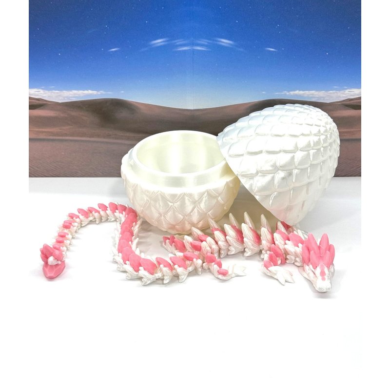 3D Printed enchanting Articulated Gemstone Dragon - a mystical creature that brings a touch of fantasy to your world. Unveil the mystery of the Satin Scaled Dragon Egg and this White and Pink Gemstone Dragon ( measures 12.5" long) a captivating fusion of elegance and fantasy. Encased within a meticulously designed crystal egg, this dragon reveals itself with a symphony of colors - a testament to its magical heritage. ------- Small Components Advisory: ------- Please note that this product may contain small components and might not be suitable for very young children. Given the characteristics of 3D printing, there is a potential for small components to detach if handled aggressively or dropped. Therefore, we advise against allowing younger children to interact with the dragon. Please consider that 3D printed objects might include minor imperfections such as layer lines. These are a natural and inherent aspect of the printing process. We strive to produce the highest quality items, and these imperfections contribute to the unique character of each piece. Recall the unique creation of each dragon, crafted exclusively for you. The color selections available are depicted in the provided photos. Please be aware that variations in color may occur due to discrepancies in filament production and the characteristics of the monitor or screen you are utilizing to view the listing. Additionally, the arrangement of prints using multi-colored filament rolls can influence color distribution. ------- Licensing Information: ------- Authorized Design: NOHo3D holds the official authorization for the production of this exquisite design created by CinderWing3D.