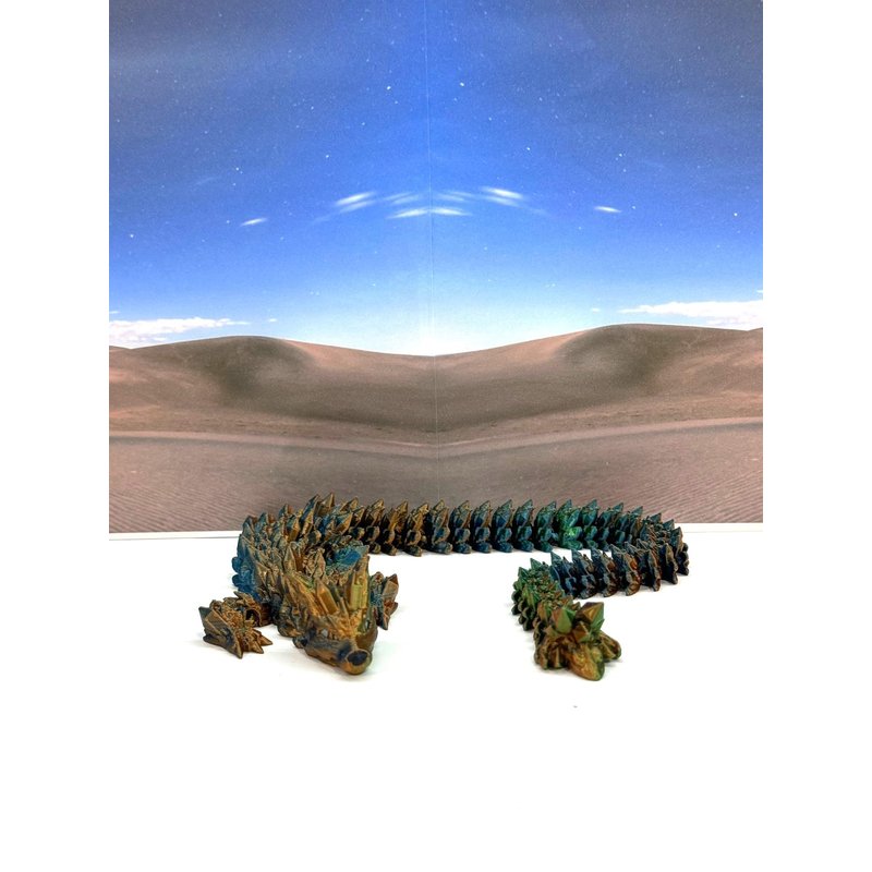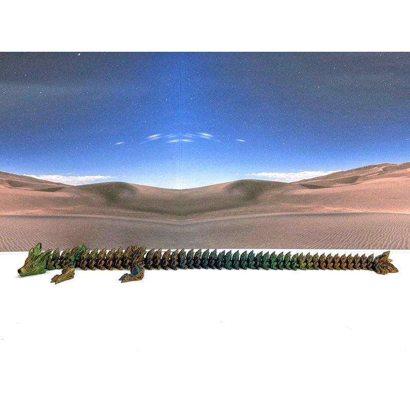 3D Printed enchanting Articulated WOLF Dragon - a mystical creature that brings a touch of fantasy to your world. Unveil the mystery of this tri color-Orange Blue Green WOLF Dragon ( measures approximately 12" long) a captivating fusion of elegance and fantasy. this dragon reveals itself with a symphony of colors - a testament to its magical heritage. ------- Small Components Advisory: ------- Please note that this product may contain small components and might not be suitable for very young children. Given the characteristics of 3D printing, there is a potential for small components to detach if handled aggressively or dropped. Therefore, we advise against allowing younger children to interact with the dragon. Please consider that 3D printed objects might include minor imperfections such as layer lines. These are a natural and inherent aspect of the printing process. We strive to produce the highest quality items, and these imperfections contribute to the unique character of each piece. Recall the unique creation of each dragon, crafted exclusively for you. Authorized Design: NOHo3D holds the official authorization for the production of this exquisite design created by CinderWing3D.