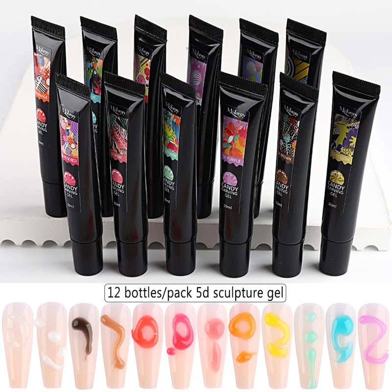 - 【Package】 You will get 12 colors 10ml nail art sculpture gel,including color of black,white,red,pink,blue,yellow,clear,brown,green,purple,orange....