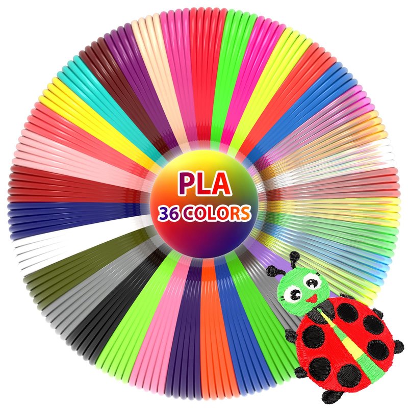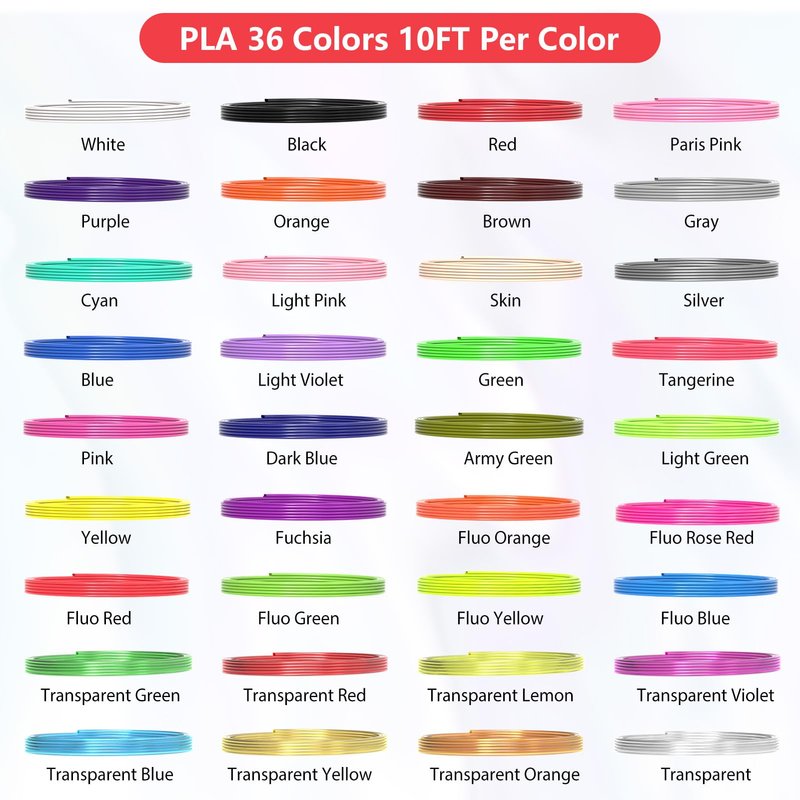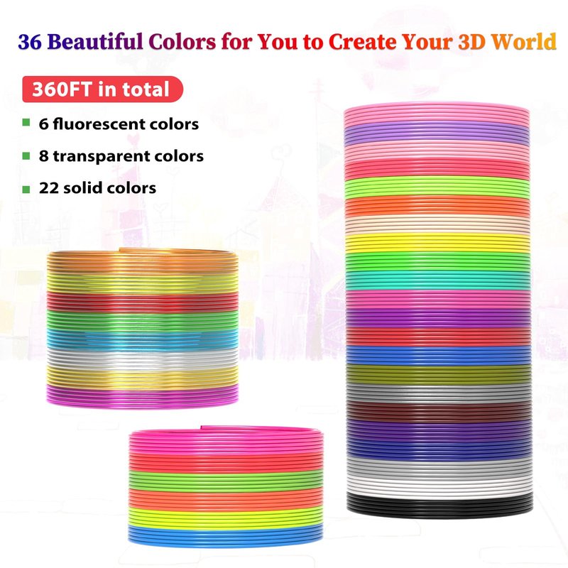 - [36 COLORS INCLUDED]: This 3d pen filament refills comes with 8 transparent colors, 6 fluorescent colors and 22 popular solid colors. 36 colors 10 feet each color, 360 feet in total. The 3d pen filament is a great choice and gift for 3D printing. It will give you more creative options.