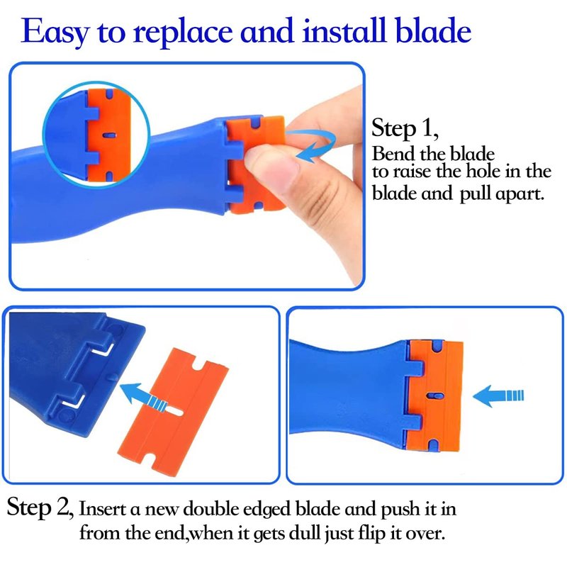 - Plastic Razor Blads Replace and Install, (1) Turn the orange blade over to the surface of the hard object. (2) Press the blade at the same time and use your finger to eject the blade. (3) Remove the old blade and replace it with a new one.The plastic blades are double eged,when it gets dull just flip it over. We are striving to provide high-quality glass scraper with razer blade and excellent service.