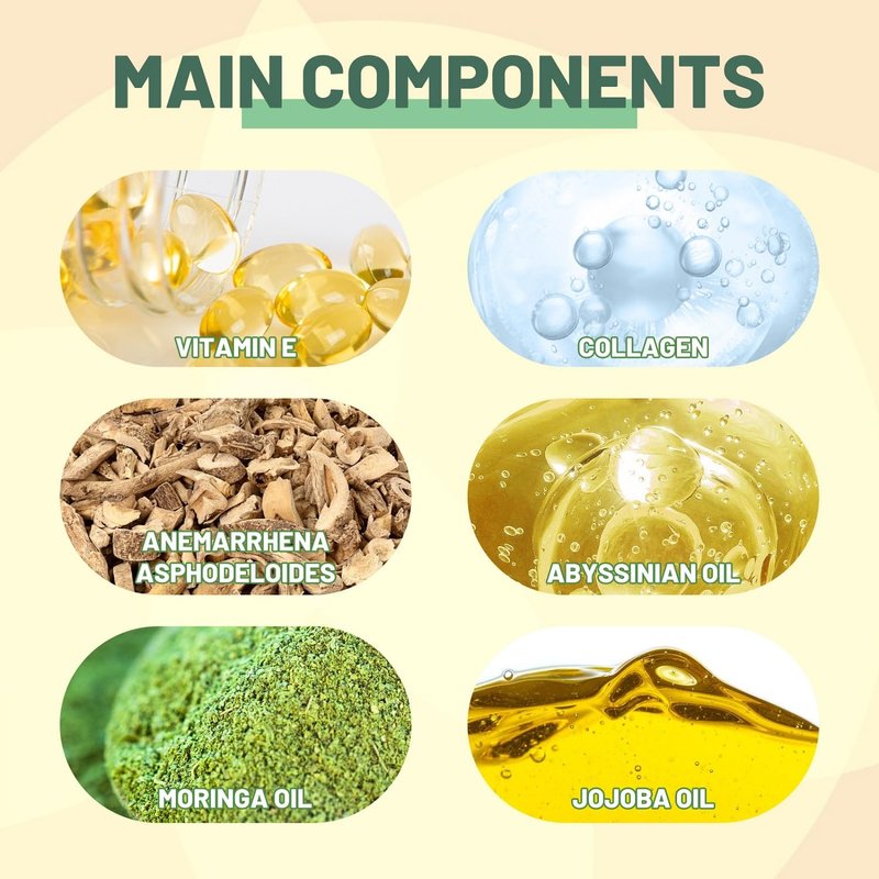 Ingredients: Collagen, Abyssinian oil, Moringa oil, Anemarrhena Asphodeloides, Jojoba Oil, Vitamin E.
