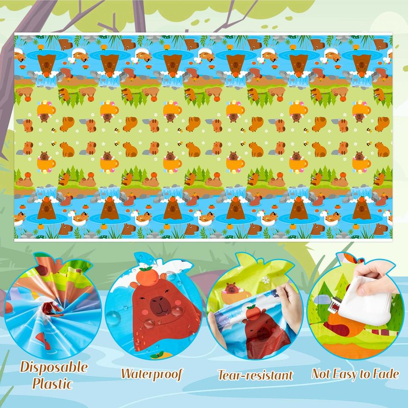 - OCCASION: Whether you're hosting a capybara themed party, a animals themed party, a birthday party, Christmas or any other party, our capybara birthday tablecloths are perfect for you. These capybara themed one-off party tablecloths are not only suitable for the dining table, but can also be used as picnic blankets, wall hangings, or even unique gift wrap for kids.