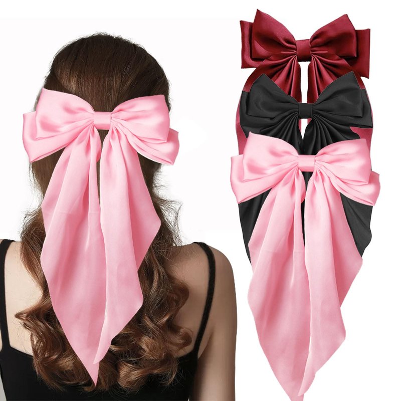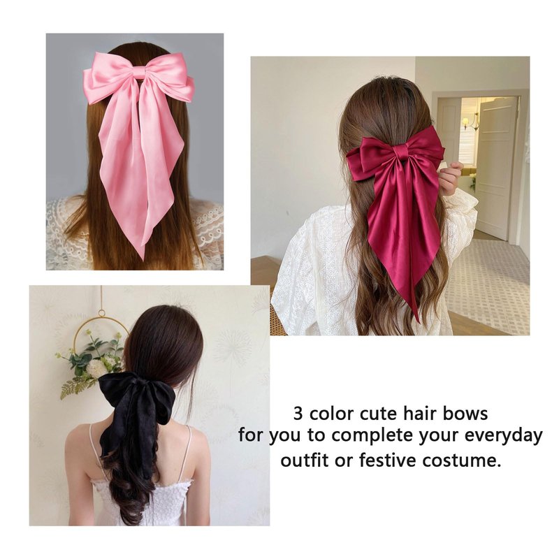 3PCS Hair Bows for Women, Oversized Long Tail White Hair Bow Clips, Silky Satin Hair Ribbons Ponytail Holder for Women Girls (Black, Red, Pink)