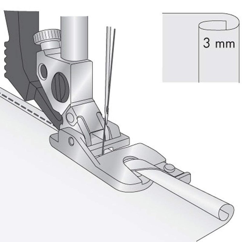 - 6mm, 4mm and 3mm rolled hem presser foot, Roll fabric edge and hem stitch at the same time