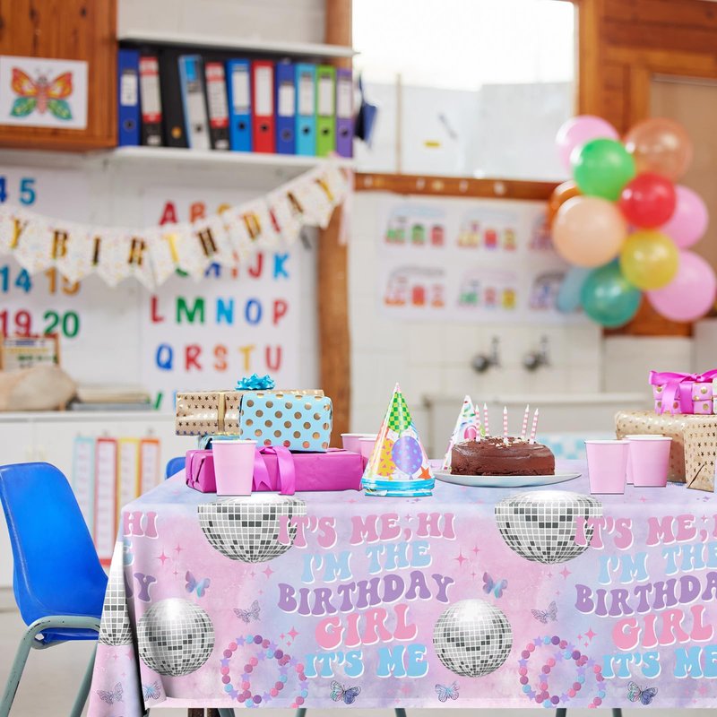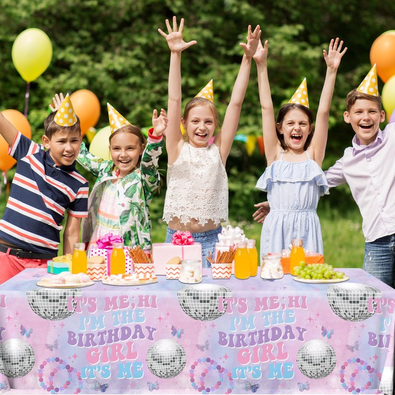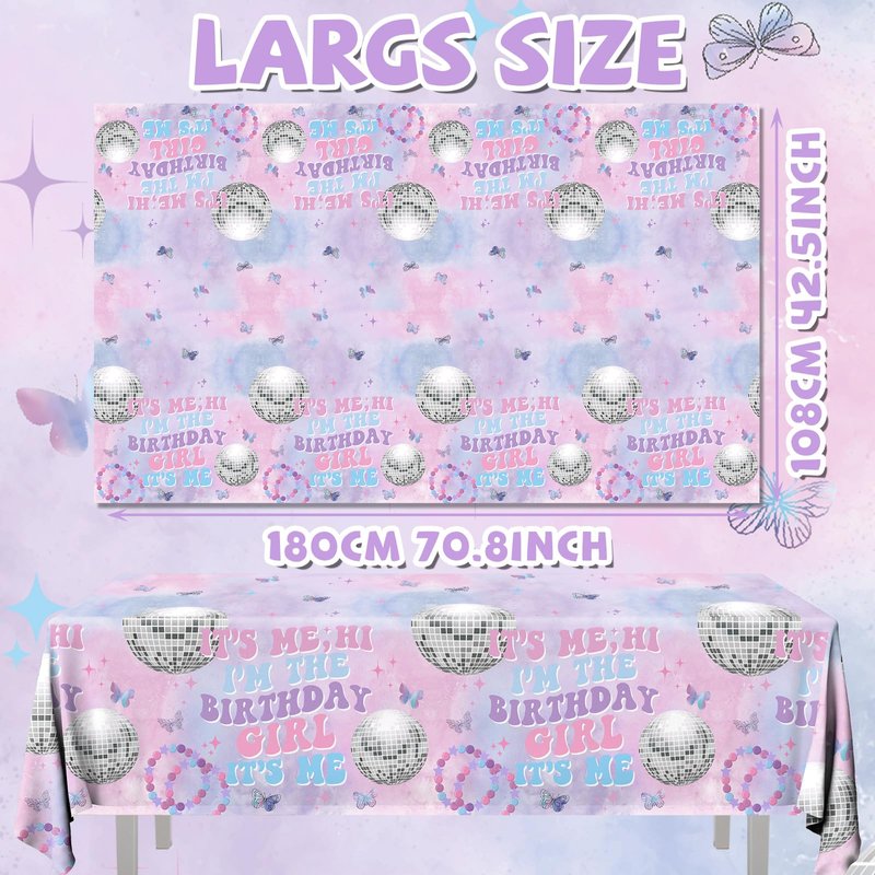 - xtralarge tablecloth: our girl birthday supplies comes with 3 pieces of tablecloth printed with splish splash “its me hi im the birthday girl” . the its me hi im the birthday girl its me is shine and very eye-catching. with luxurious pink and purple background, birthday party sparkles. adding festival atmosphere by setting these beautiful music birthday decorations table cover for the party cheers