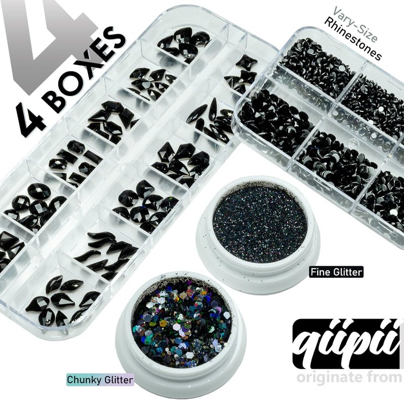 qiipii 4 Boxes Black Nail Rhinestones Fein Glitters Chunky Glitter Powder Kit, 24 kinds of Shapes K9 Glass Crystal Jet Black Gems Flatback Round Stones Diamonds Crystals Nail Art Supplies Nail Charms Body Glitter Face Glitter Eyeshadow for Acrylic Nails Faces Body Makeup DIY Crafts