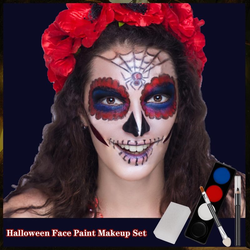 - 【Full Halloween Makeup Kit】Kit Includes: Eyebrow Pencil, Makeup Brush Sponge and 4 Colors Face Paint. Classic red black white blue face body paint can use for face and body. Which could meet you all demands.