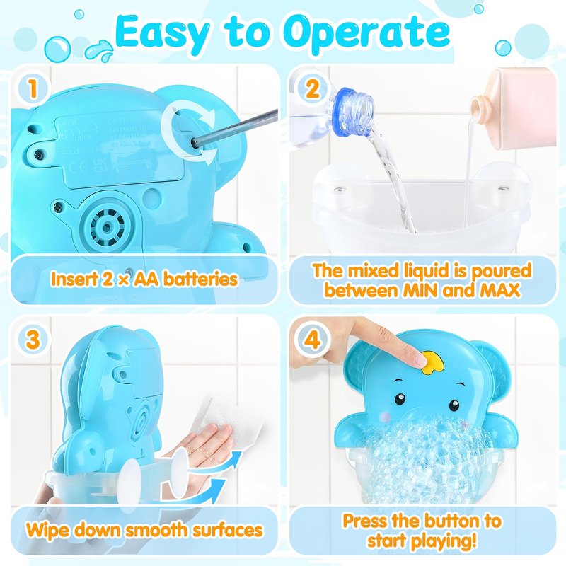 - 4 in 1 Bath Toys for Kids Ages 1-3: 1 pack elephant bath bubble machine and 3 pack floating wind up toys in exquisite gift box packaging. Vivid small animals swimming in the water to attract baby and create an enjoyable and funny experience for little one during bath time. Making bathing fun that baby no longer cries because of bathing.