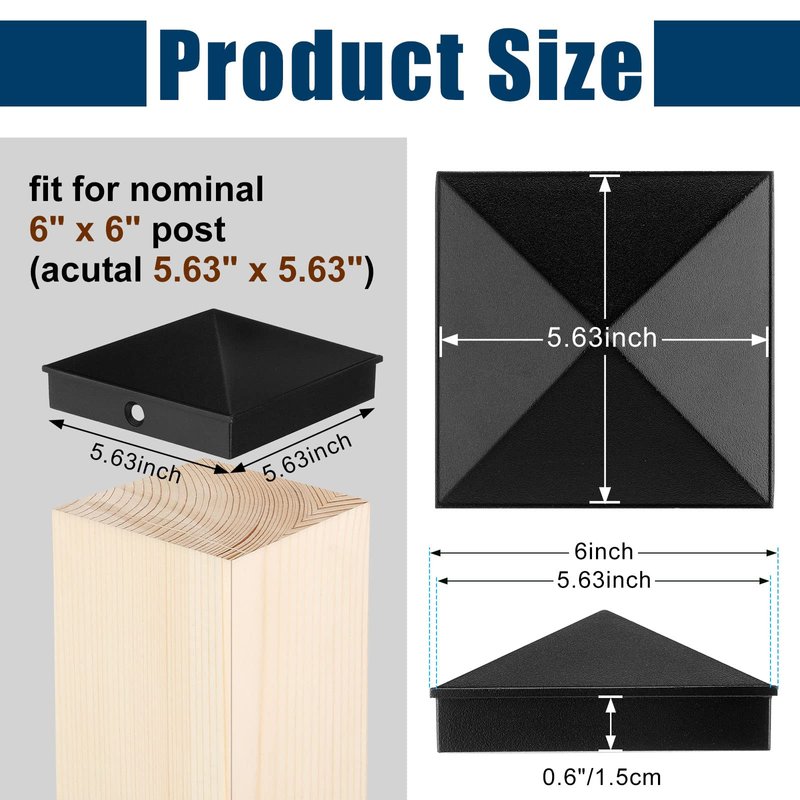 - Standard Size: our aluminum metal post caps measure 5.63" x 5.63" and fit nominal 6" x 6" (actual size is 5.5" x 5.5") square posts; The size of 6x6 post caps are fixed when they are sent to you and can't be applied for posts of other sizes, because the suitable size can provide the best protection
