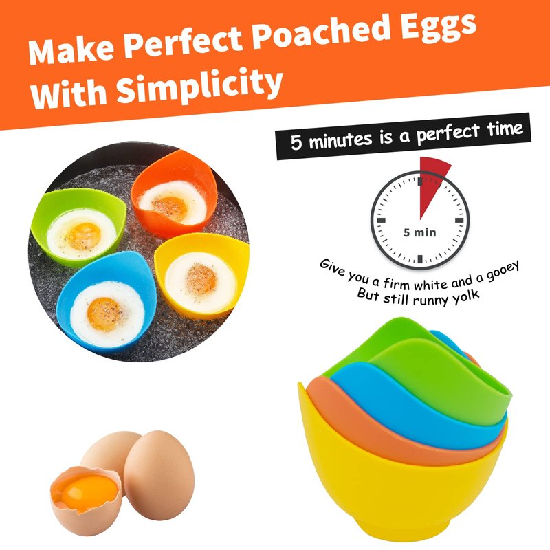 - The product includes 4 silicone egg poacher, and comes with a silicone oil brush, all made of food-grade silicone, BPA-free, including 4 colors, yellow, orange, blue and green.