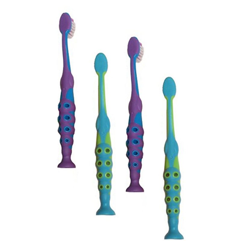 Fun design with suction cup feet will keep kids sticking to their twice-a-day routine. These brightly colored brushes feature soft bristles that are rounded and polished to provide effective brushing without damage to the gums. Brush Head Length: 1"inch, Width: 1/2" inch wide. Brush length: 6.25" inches from suction base to top of brush head.