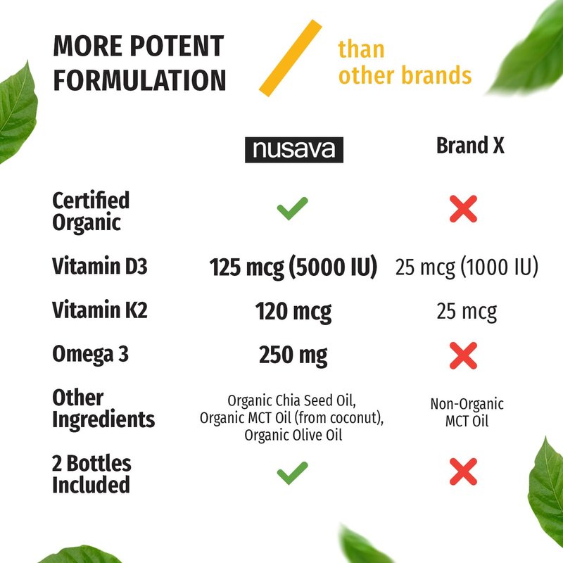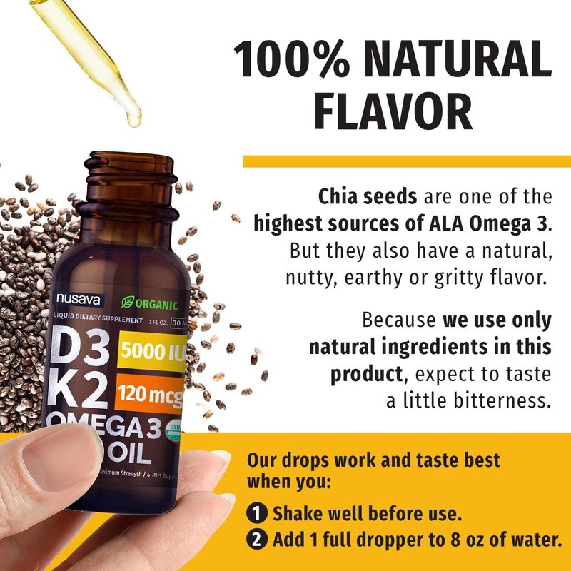 Get your daily dose of essential multivitamins with the Nusava Vitamin D3, Vitamin K2, Omega-3, and MCT Oil supplement. Created to be an all-around convenient liquid vitamin D, this 4-in-1 maximum strength supplement comes in a 1 fl. oz/30 ml dropper bottle. With 30 servings of each bottle, you have 2 months' worth of potent Vitamin D k2 support. Compared to D3 + K2 supplements, vitamin a 10000 iu, d3 with k2 pills, d drops, k2 spray, k drops, d3+k2 vitamins, liquid d drops, liquid vitamin d3 with k2, orthomolecular vitamin k2 with d3, ortho molecular vitamin k2 with d3, vitamin a drops, vitamin d3 drops, vitamin d 1000, vitamin d 1000 iu, vitamin d 10000, vitamin d 10000 iu, vitamin d complex, vitamin d3 1000, vitamin d3 1000 iu, vitamin d3 10000 iu, vitamin k2 mk-7, vitamina d3 10000 iu, vitamin d3 + k2, vitamin d oil, vitamin d sublingual, vitamin b12 drops, vitamin d3 plus k2 drops, vitamin d and k2, vitamin d drops adult, vitamin d + k2, vitamin d liquid drops for adults, vitamin d liquid organic, vitamin k2 drops, vitamin d + k2, vitamin d with k2, vitamin k drops, vitamin k drops newborn, vitamin k oil, vit d3 k2, vit d3 k2 drops, vitamin k, vitiam d3 5000 iu, liquid vitamin c, vit e, vitamin c drops, vitamin c liquid, vitamin d 400 iu, vitamin d3 2000 iu softgels, vitamin d3 2000iu, vitamin e liquid, vitamin e oil, vitamin k2 100 mcg, vitamina e oil, vitamine e, and vit d drops adults, ours allow you enjoy to the benefits of multiple supplements and active ingredients in one convenient vit d k2 liquid drop that gives your body the necessary nutrients to conquer the day's challenges. Ingredients: Vitamin D3 5000 IU / 125mcg Vitamin K2 (MK4 62.5% and MK7 37.5%) / 120mcg Omega 3 (Alpha Linolenic Acid) / 250mcg Organic MCT Oil (from coconut) Organic chia seed oil, Organic olive oil. What You Get: 2 dropper bottles of Nusava Vitamin D3 K2 MCT Oil Omega 3 Liquid Vitamins Each bottle contains 1 fl. oz. or 30ml Serving size: 1ml (20 drops) Servings per bottle: 30