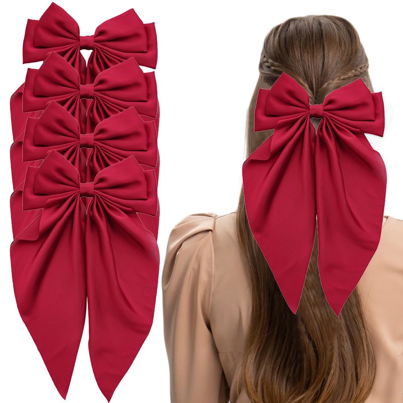 4 PACK Red Satin Bows Hair Barrettes, Hair Bows for Women, Hair Bow with Long Tail, Long Tail Valentine's Day Hair Accessories, Hair Accessories for Women