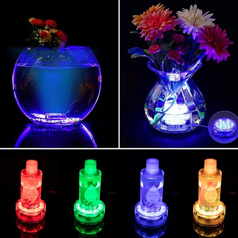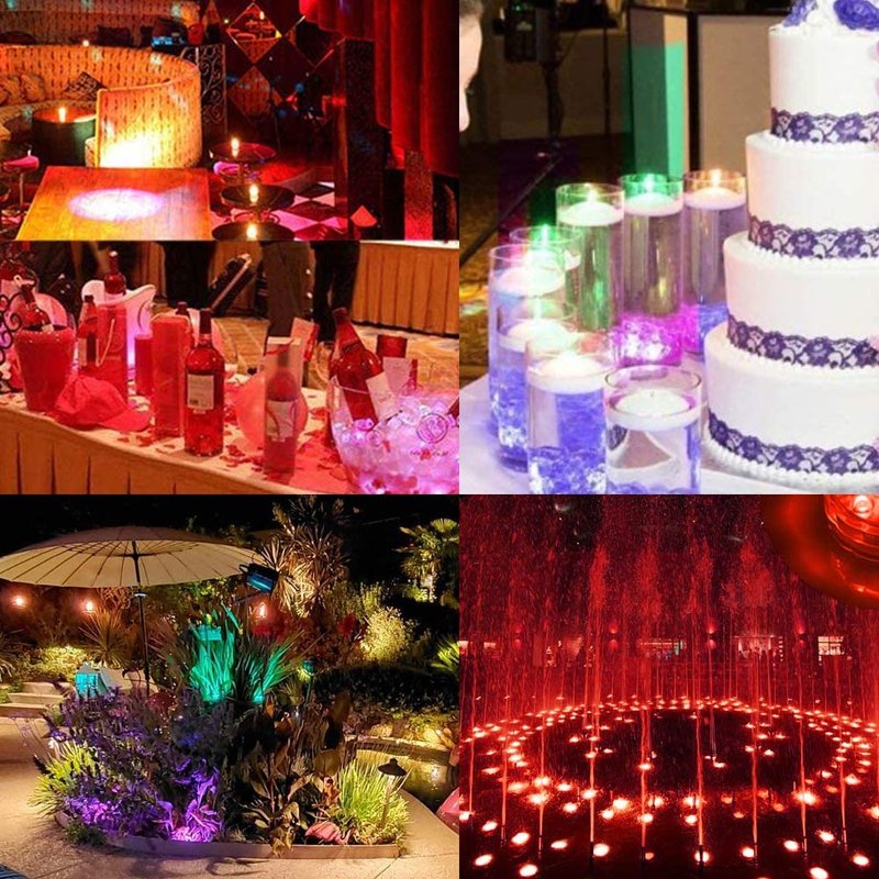 4 Pack Submersible Led Lights with Remote, 16 Colors Waterproof Pool Lights. Underwater Pond Lights, Submersible Led Lights Battery Operated, Aquarium Fountain Pond Wedding Halloween Party Lights Decorations. Widely Used Party Event Illumination for Aquarium Fountain Pond Wedding Halloween Party Lights Decorations. Holiday Accent Lighting for swimming pool, pond, ice bucket, fountain, waterfall and more. Home Accent Lighting: indicator light, night light, novelty light, etc. Specification Dimension: 2.8*1.1in Light battery: 3 x AAA batteries (not included) LED source: 10pcs SMD LED diode IR remote battery: CR2032 Button Cell batteries (included) IR Controller 16 different static colors: press the color button on the remote to select color. Brightness: press Up or Down button to adjust the brightness of static lighting. Dynamic color changing effect: select Strobe after selecting your desired colors. To achieve dynamic changing effects, Select from Fade, Flash, and Smooth to view colors changing in default order. Warning Tighten the cap (clock wise rotation) until you can not any more before placing it under water. Water can erode light quickly if the cap is not at absolute tightest position. Special occasion lighting only. Please take it out of water after using. DO NOT keep it under water forever.