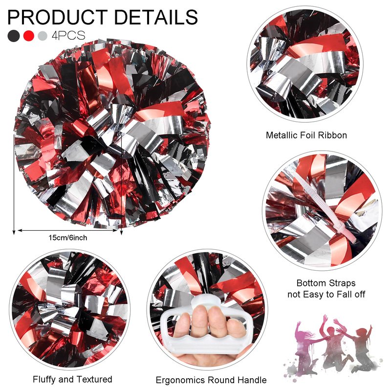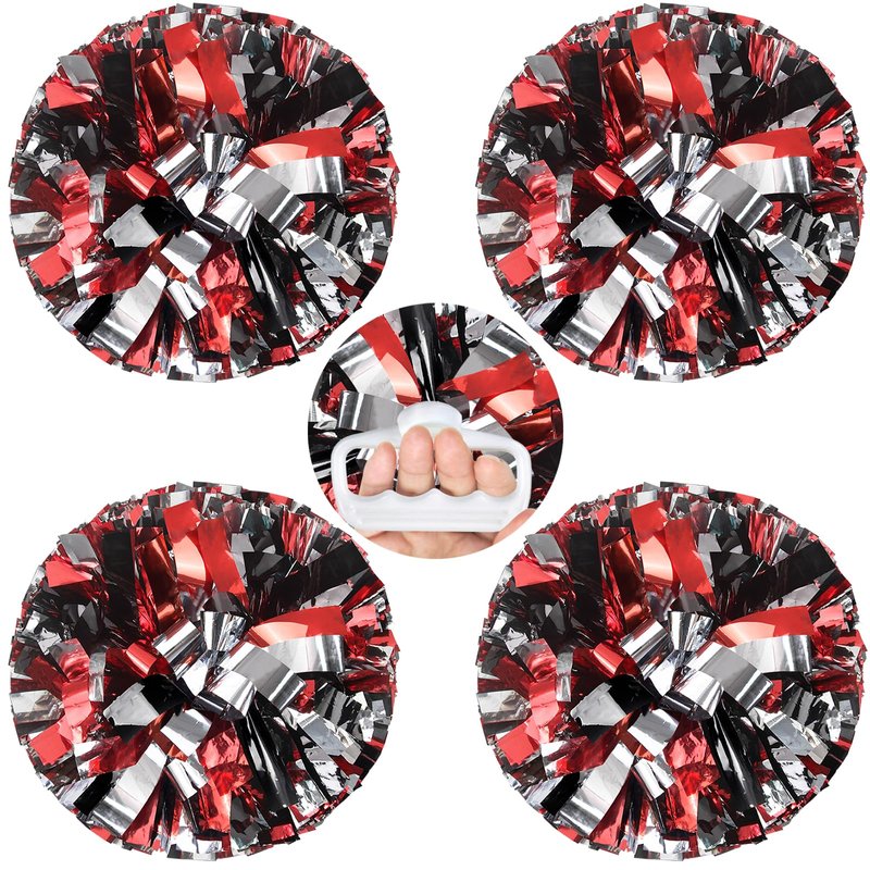 4 Packs Metallic Cheerleading Cheer Pom Poms, AUHOKY Fluffy Cheerleader Pompoms with Finger-friendly Ring, Cheering Pom poms for Squad Team Sports Game Dance Dress Party Kids Adults (Black/Silver/Red)
