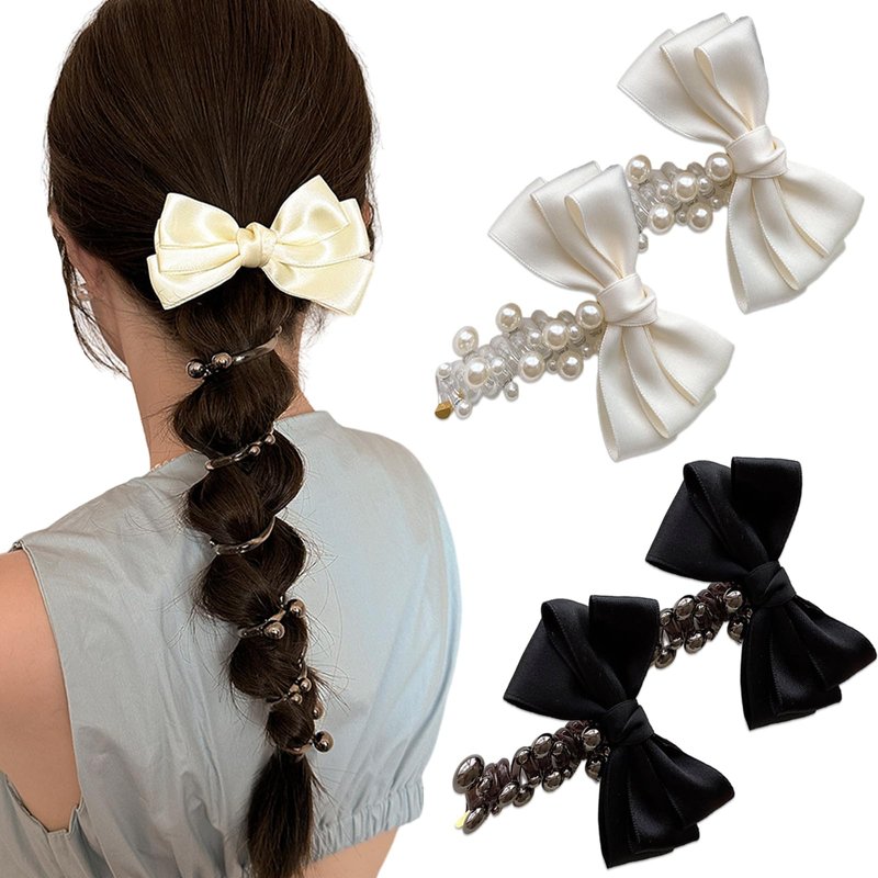 4 Pcs Bowknot Braided Telephone Wire Black White Pearl Hair Bands Elastic Spiral Hair Ties Phone Cord for Women Elegant Ponytail Holder Accessories