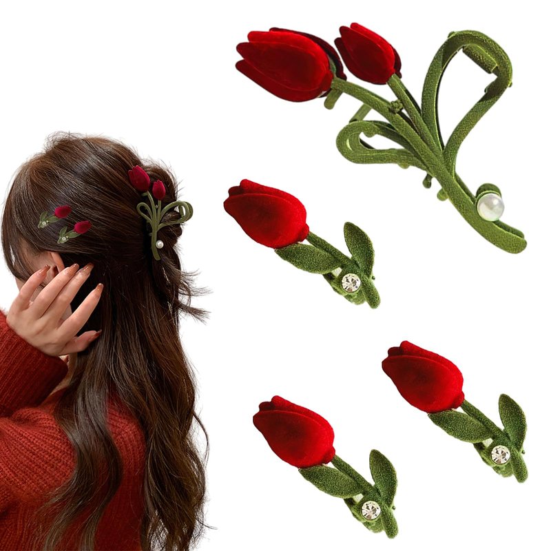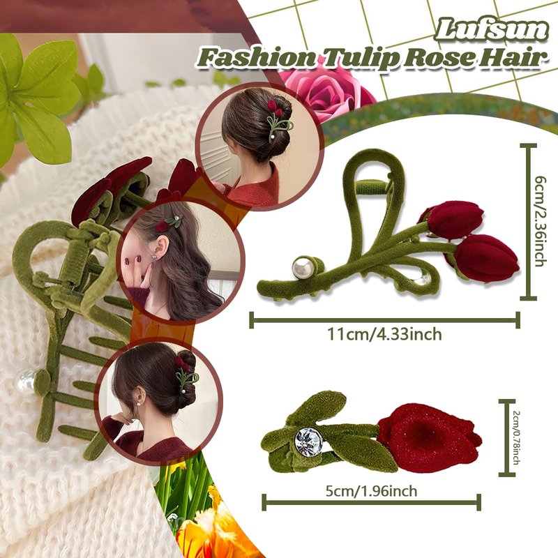 - The product includes 1pc tulip claw clip and 3pcs rose hair clips, they are plush texture with rhinestone inlay embellishments, which will satisfy your need for decoration while enhancing your experience, so you can all have a good mood every day.