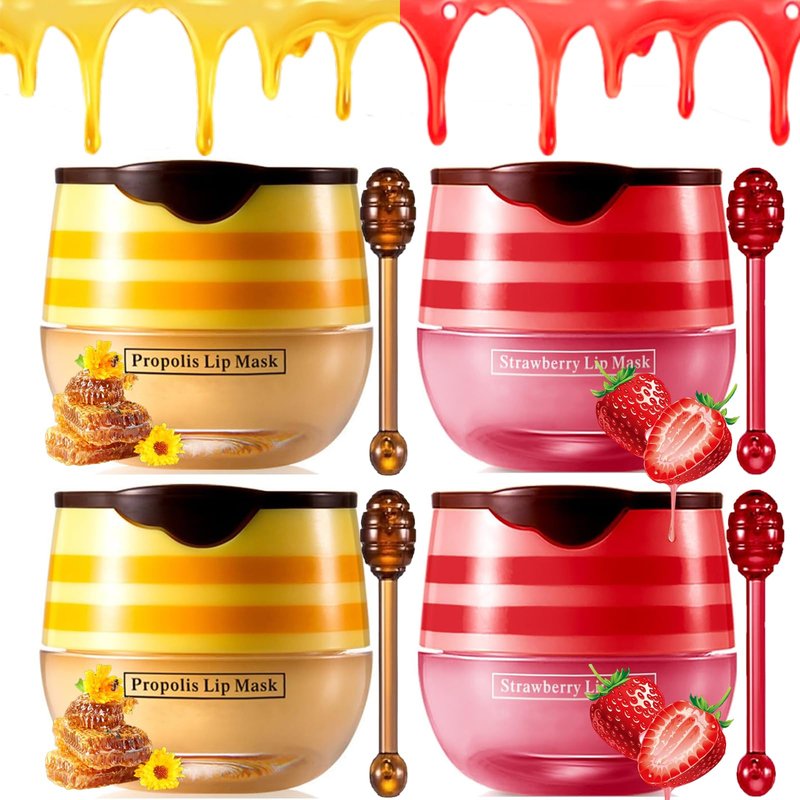 4 PCS Honey Lip Balm Pot, Honey & Strawberry Lip Sleeping Mask Vitamin E & Moisturizing Propolis Lip Balm with Stick, Prevention Dry and Cracked Lip Scrubs Exfoliator Lip Wrinkle