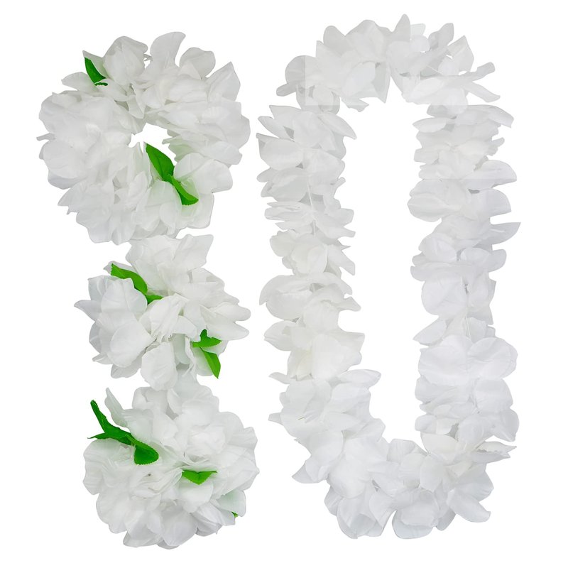 4 Pcs White Hawaiian Leis with Green Leaves for Graduation Party, Dance Party, Photo Prop in Outdoors (White-02)