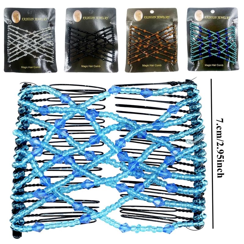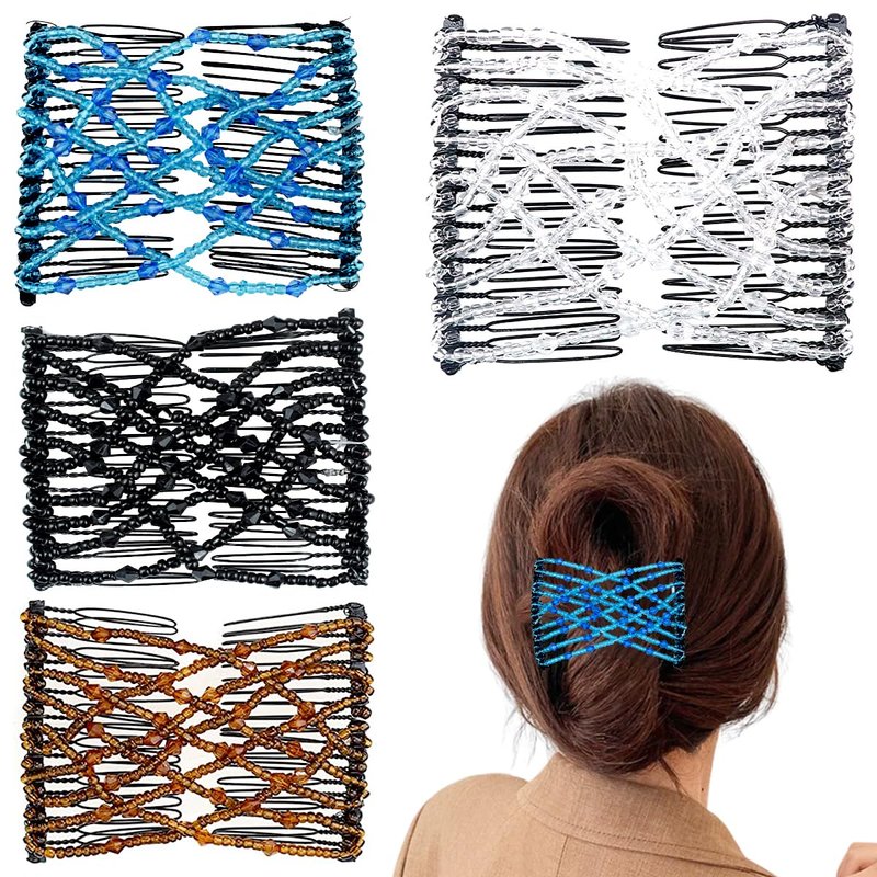 4 Pieces Elastic Hair Comb Clips Magic Stretchy Double Comb Hair Clips for Girls Women Hairstyle Hair Accessories (Beads-Black,Brown,White,Blue)