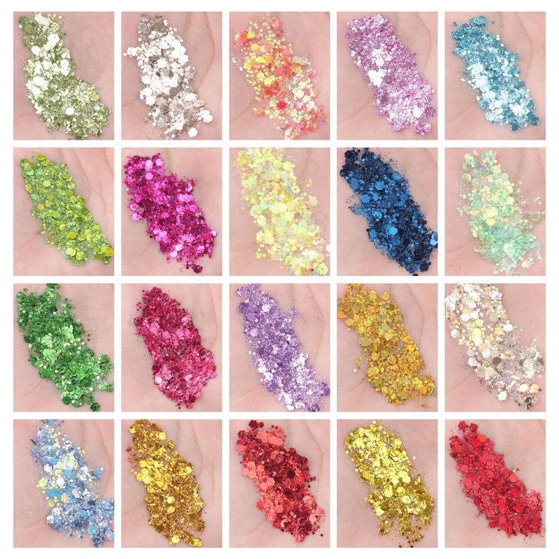 Our sparkly body glitter gel includes 40 colors, 24 colors glitter gel, 6 colors laser glitter gel, 10 colors dark glow glitter gel. This makeup glitter gel has a good mix of larger chunks and very fine glitter that makes it look very shimmery. Providing more color choices for your makeup, shine in the crowd, glitter freckles.