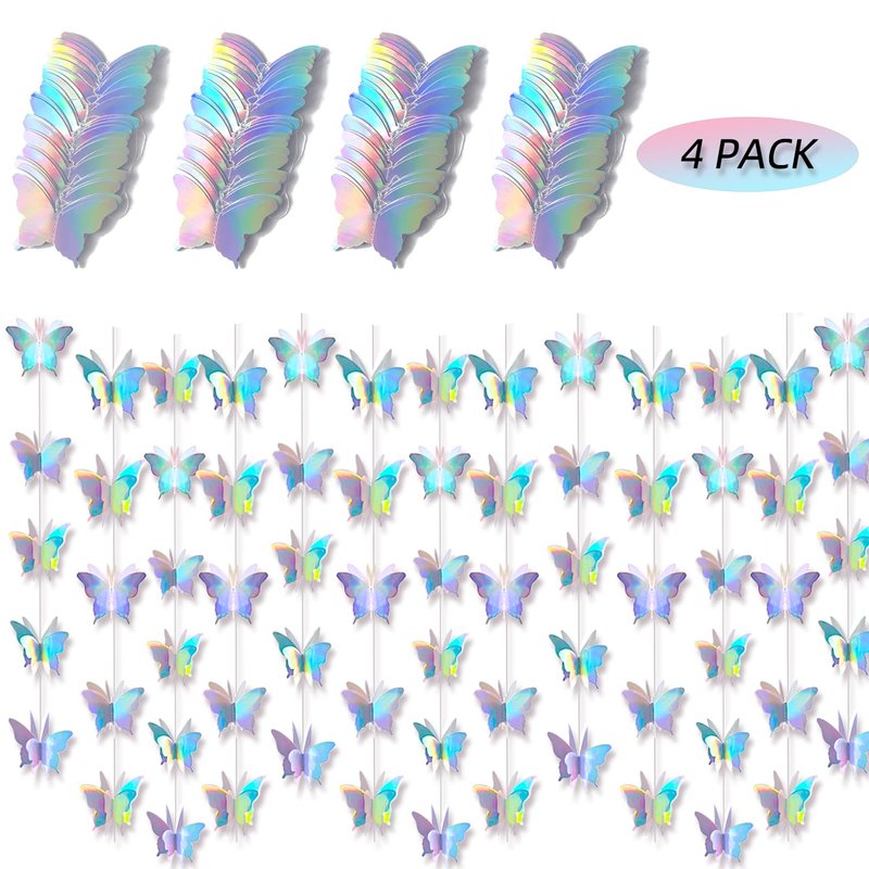 - 【Package Includes】4 Pack 3D butterfly hanging garlands(Each pack have 10 feet).Each butterfly 3 x 2.2inch (L x W). Glitter iridescent metallic butterflies garlands totally 40 ft.