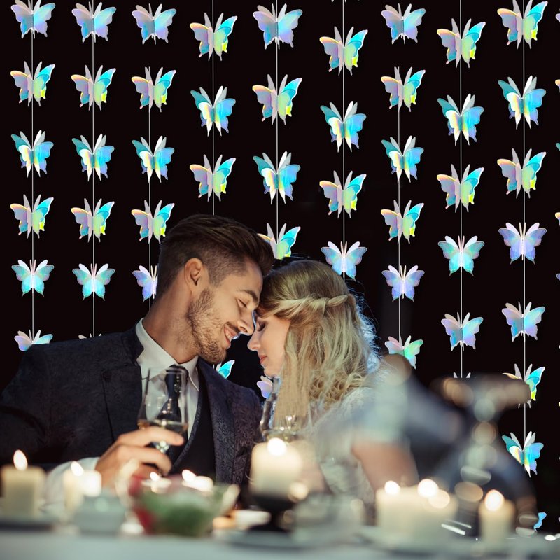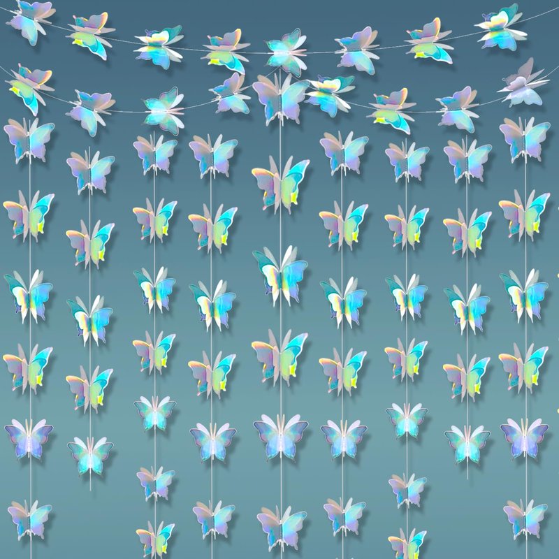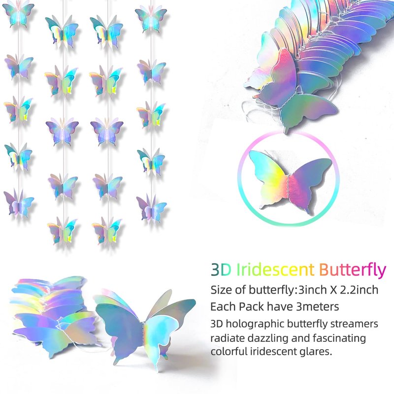 - 【Material】Special Iridescent paper card.Made from Iridescent paper stock, each Butterfly is machine stitched into a single strand.These sparkly holographic butterfly streamers radiate dazzling and fascinating colorful iridescent glares. They bring excitement, joyfulness and dreaminess to the events and settings. Perfect for adding a touch of magic to your party decorations.
