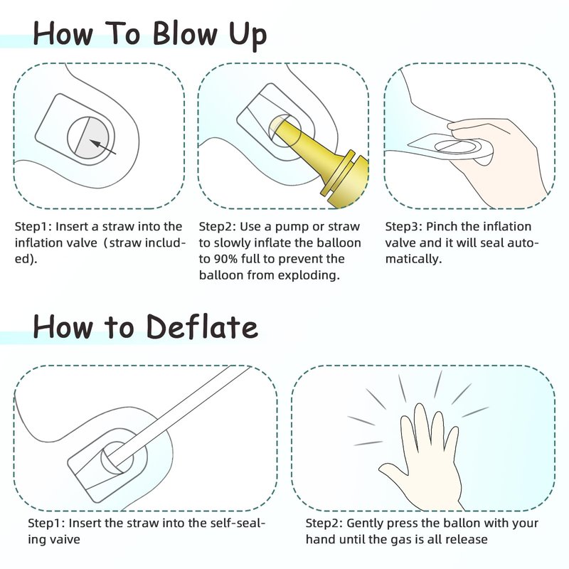 - Warning: Due to the thermal expansion and contraction characteristics of aluminum foil,To avoid bursting, please inflate the balloons slowly, please avoid filling more than 90% of air or helium. If it is over-inflated,it can easily cause the balloon to explode at high temperatures. Please avoid leaving the balloons in an outdoor high temperature environment for a long time. If the ambient temperature is too low,it will also cause the balloon to deflate. Please avoid sharp stuff.